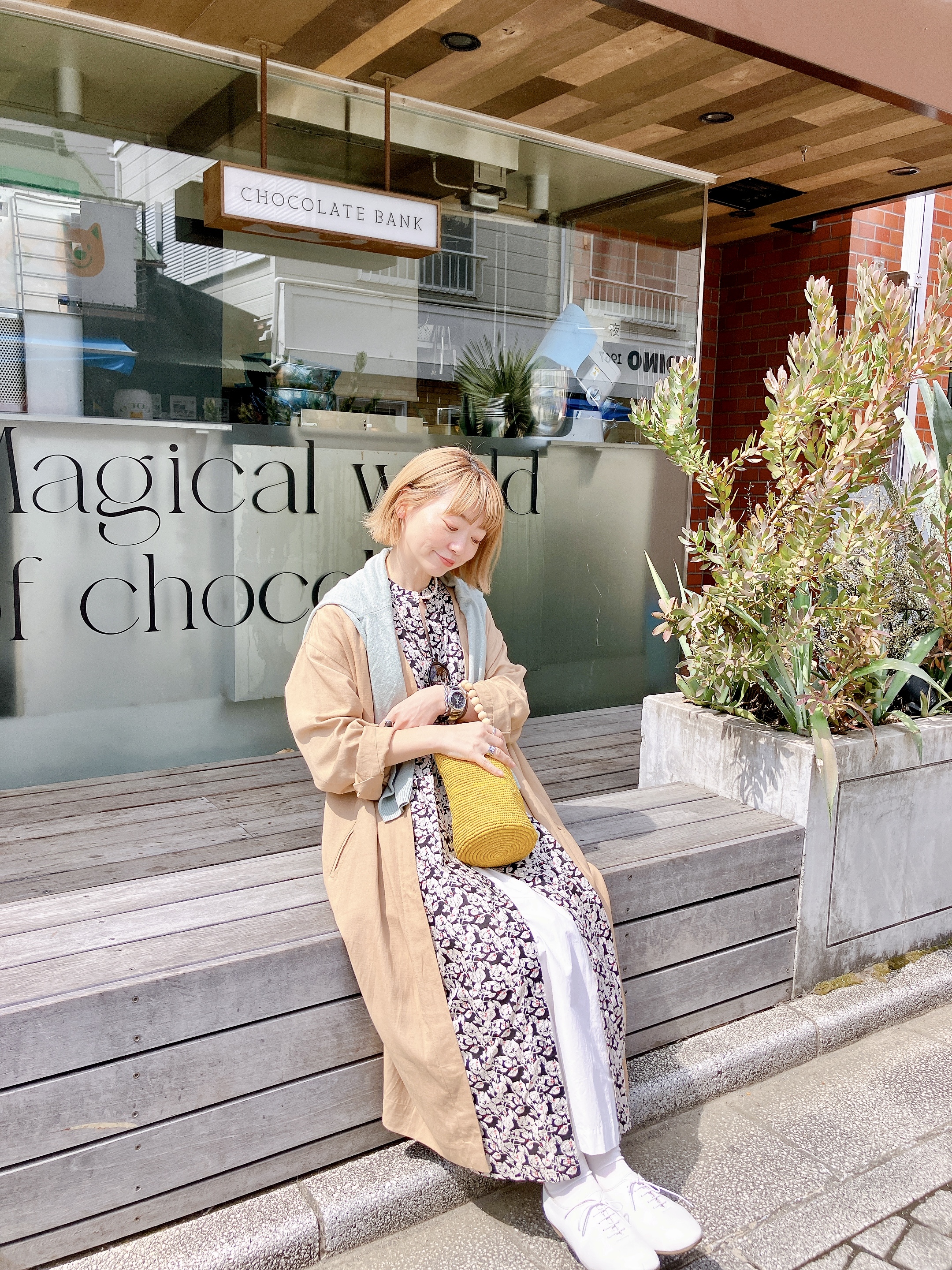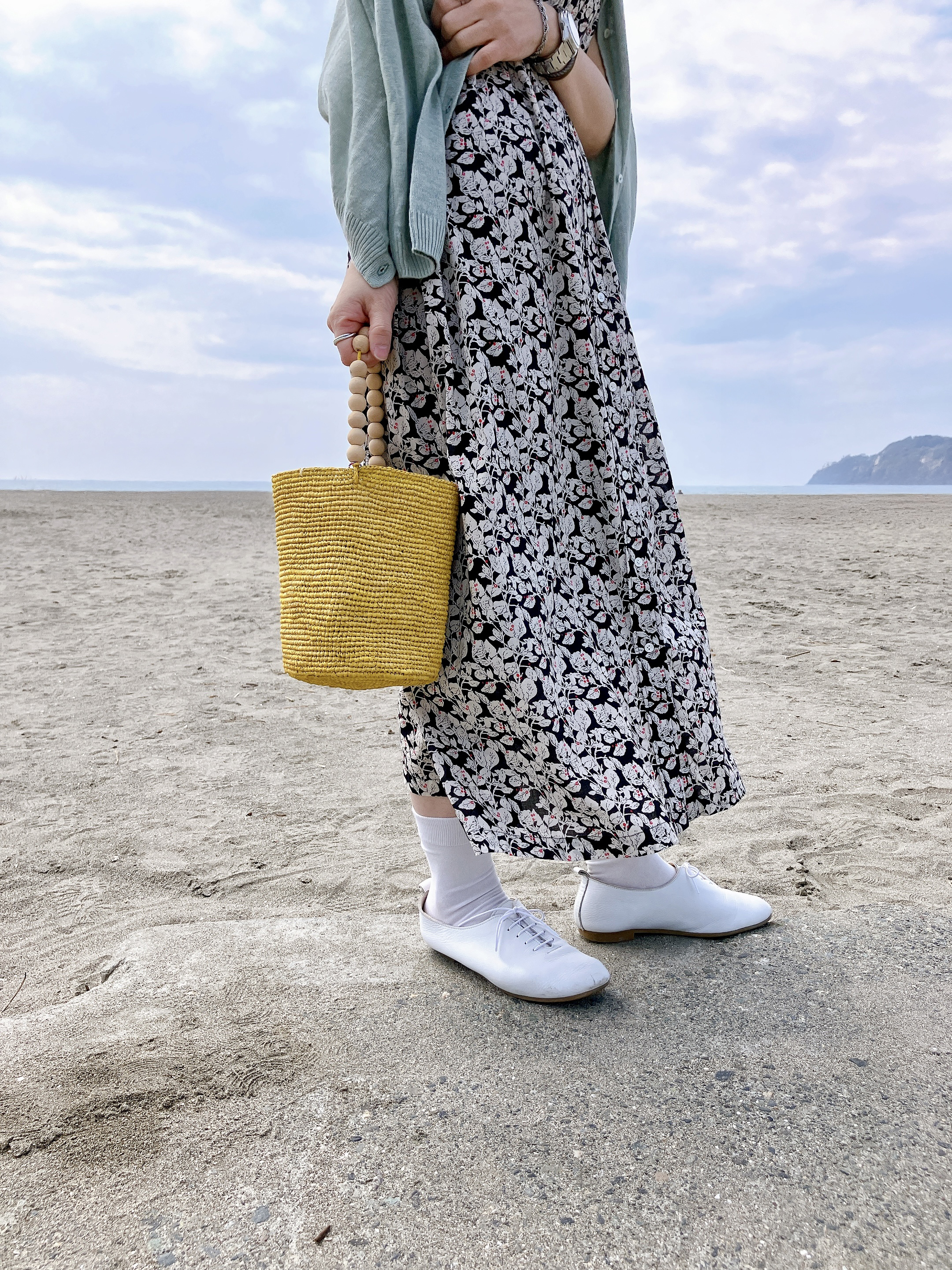 カゴバッグのイエローを差し色に、