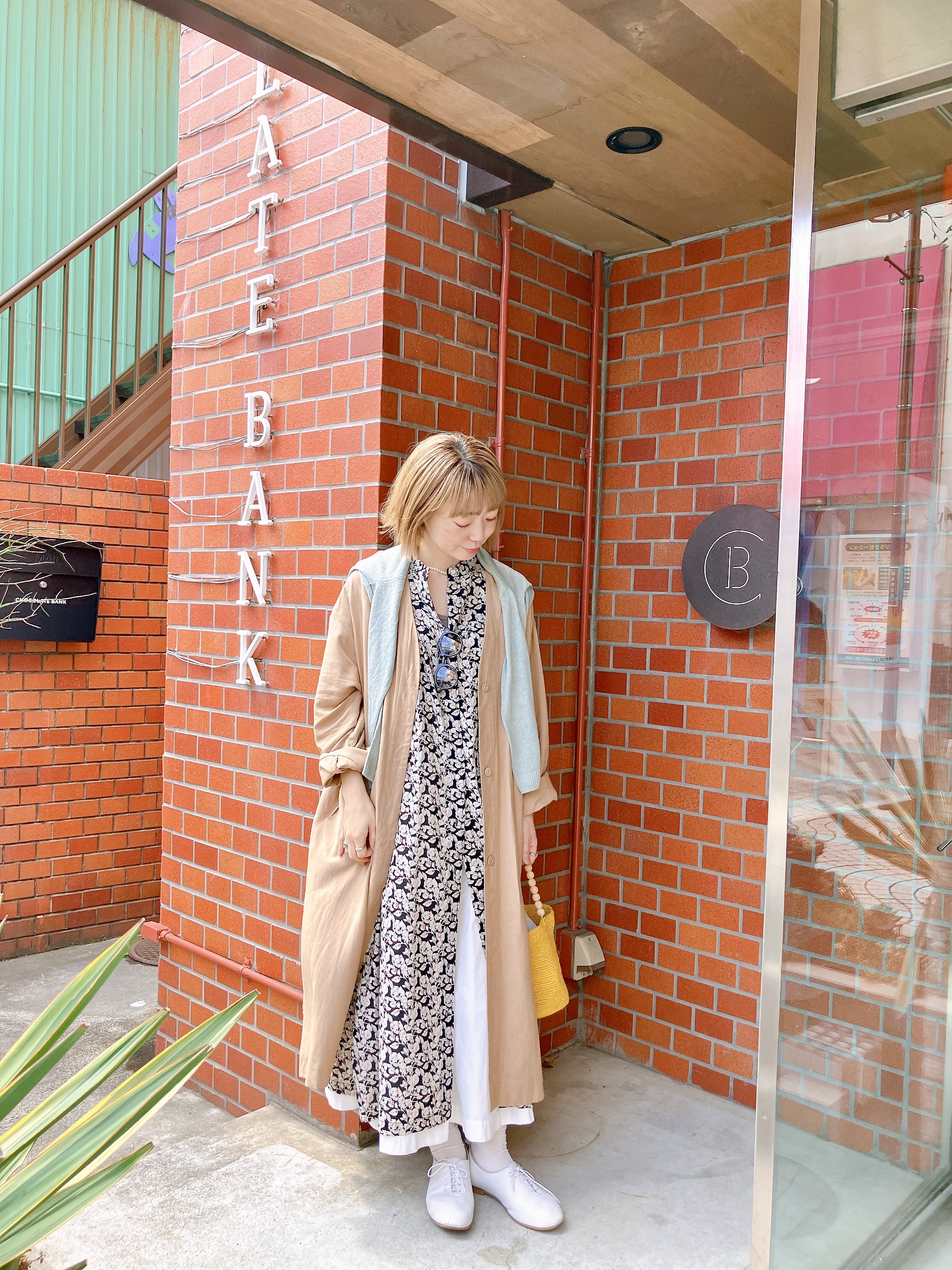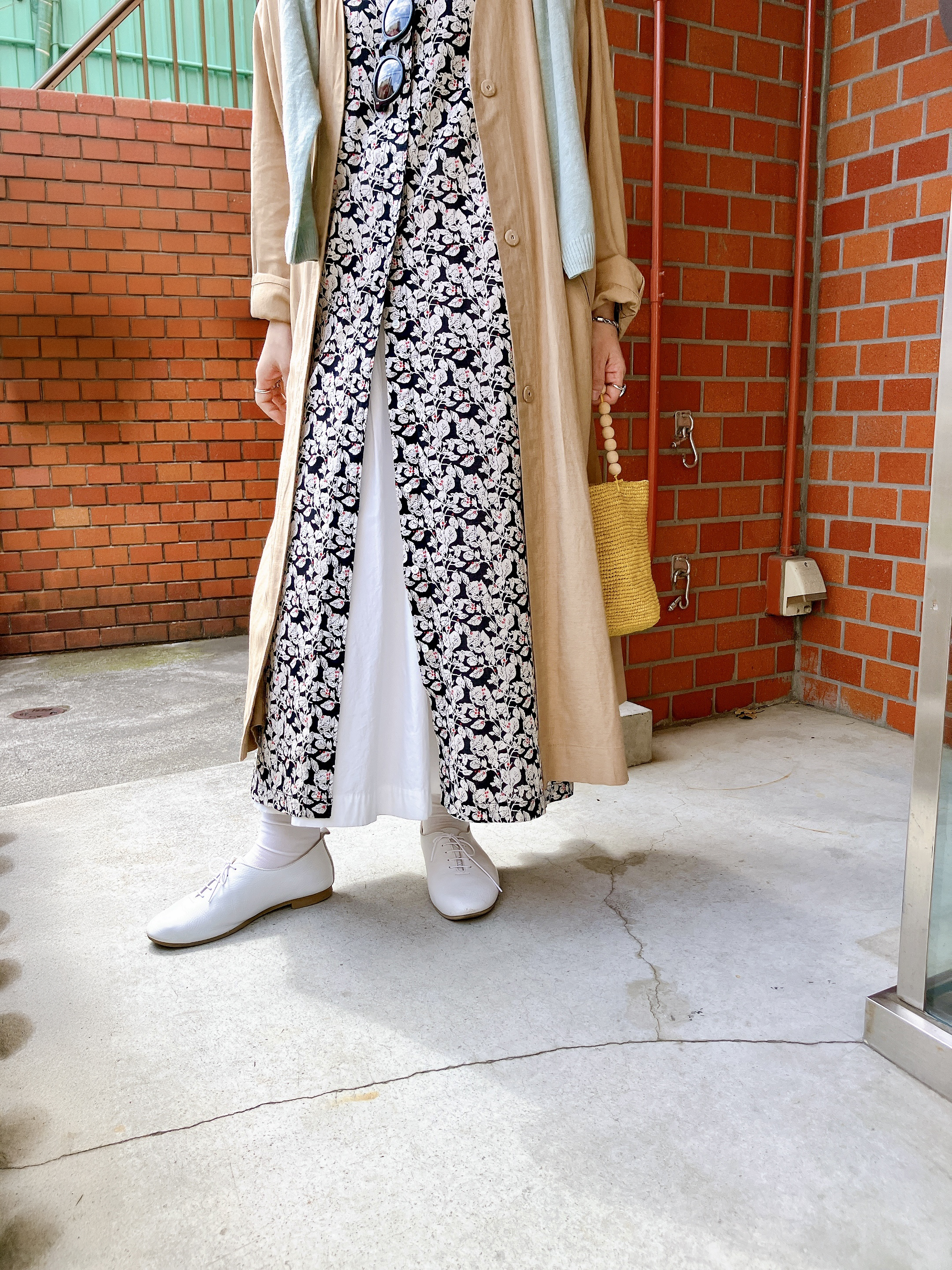 羽織りをリネンコートにチェンジし、カーディガンは肩掛けに。