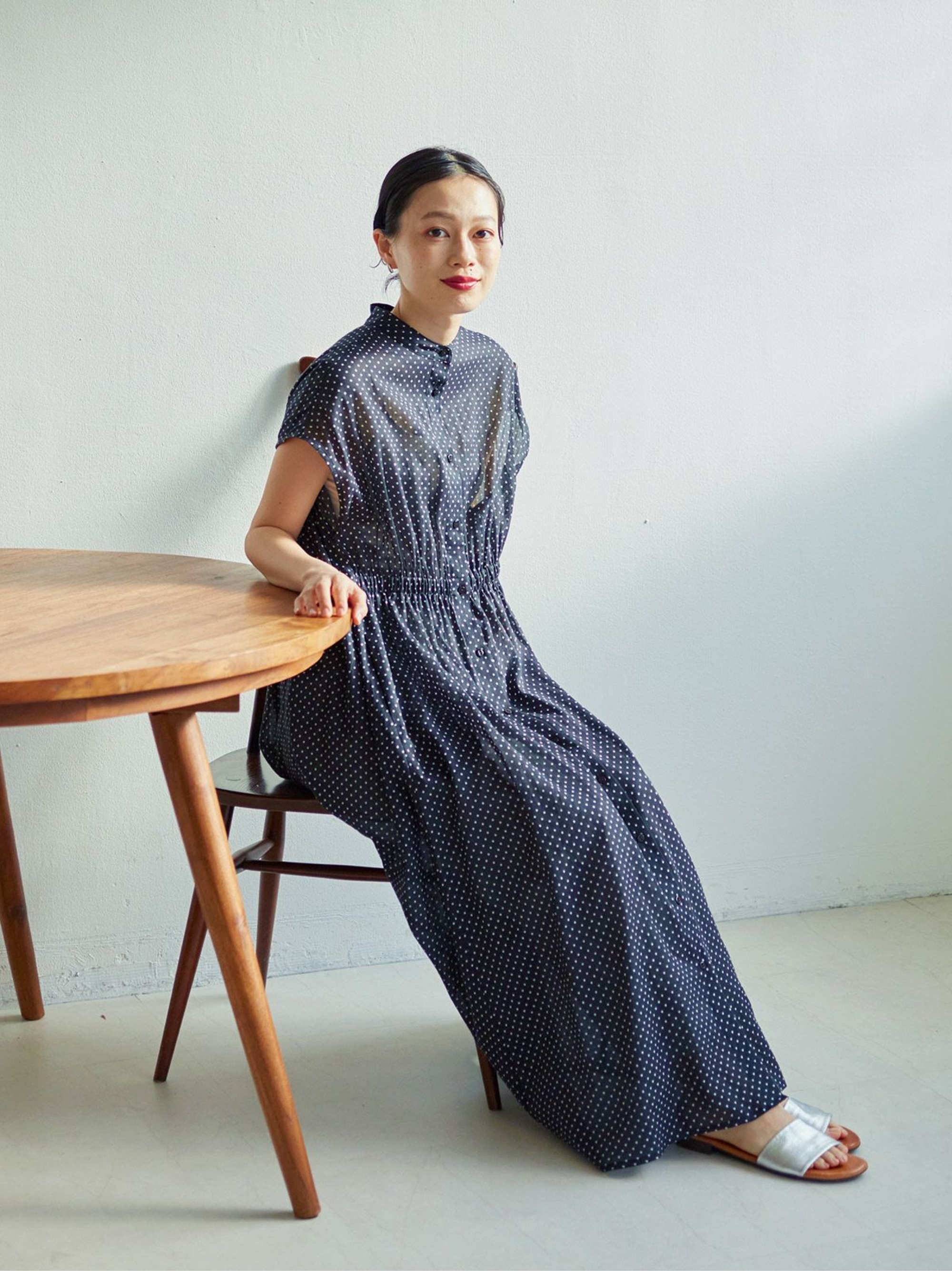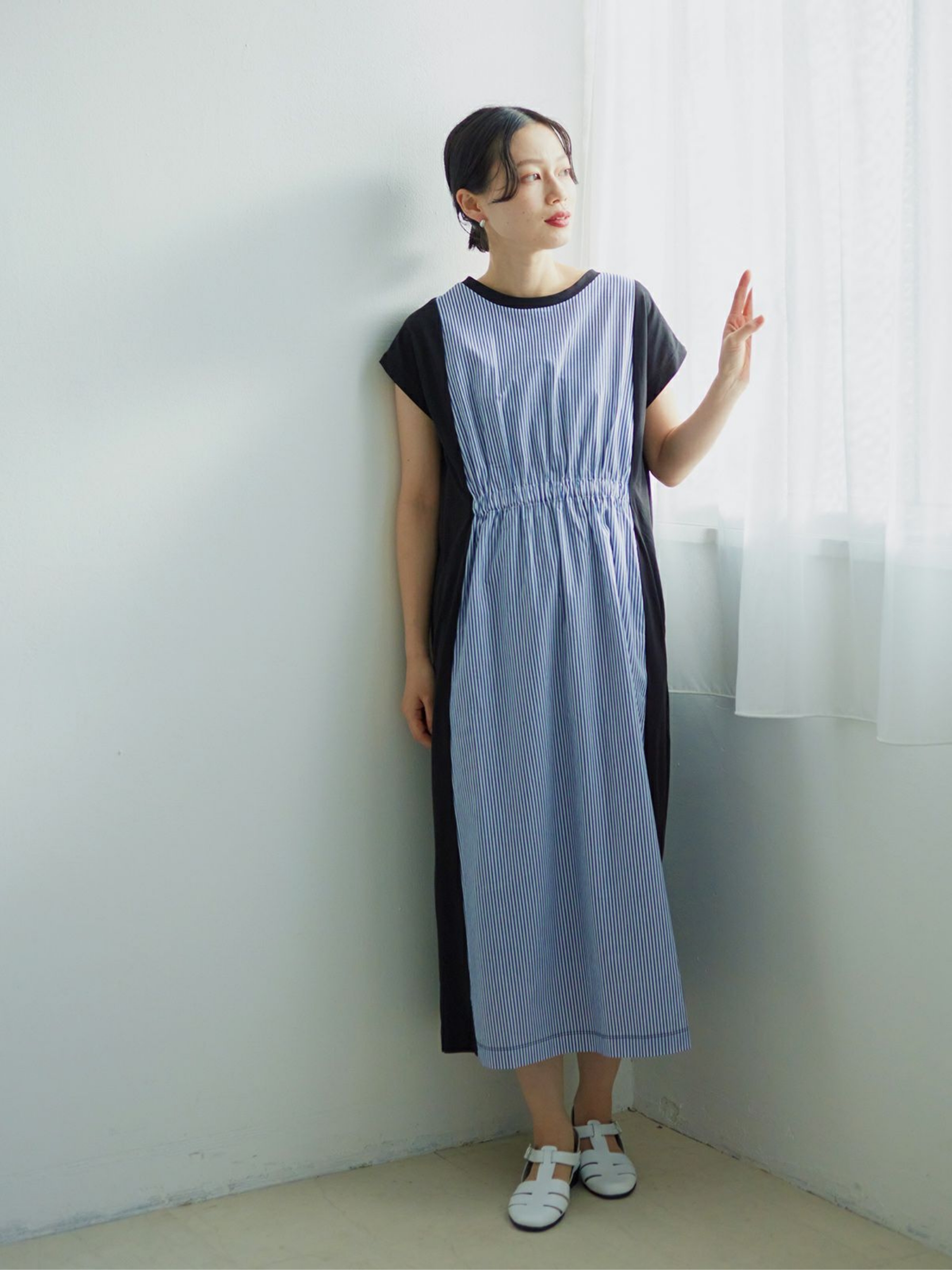 ラミーコットンギャザータックワンピース(無地/ドット)