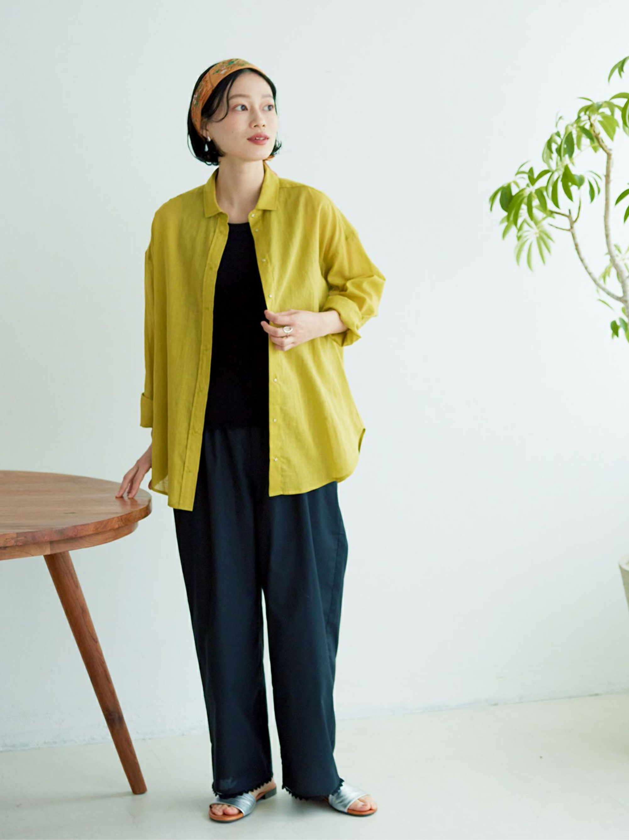 蒸し暑い時期には、タンクトップの上にさらりとシャツを羽織って。