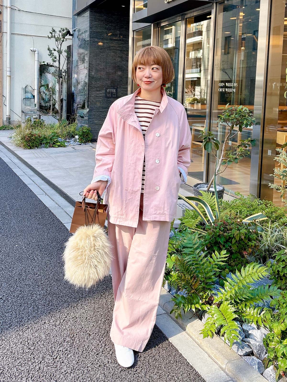ピンクのライナー付きスタンドカラーショートコートに、同じトーンの