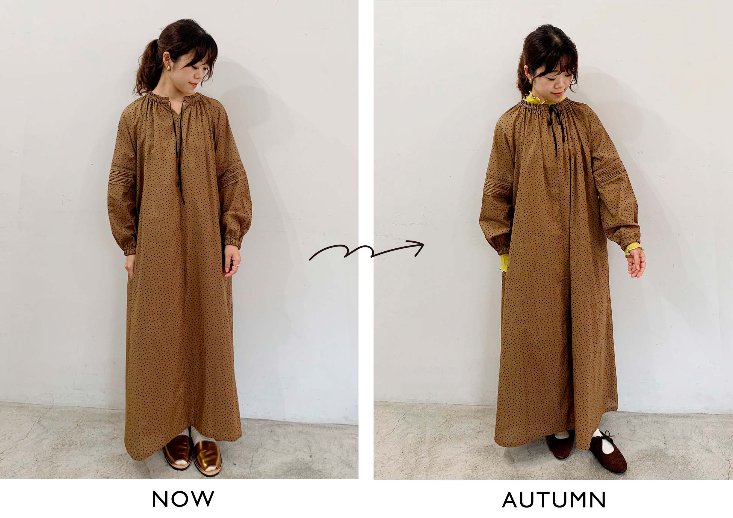NOW:薄手の生地感で今から着られるワンピース。